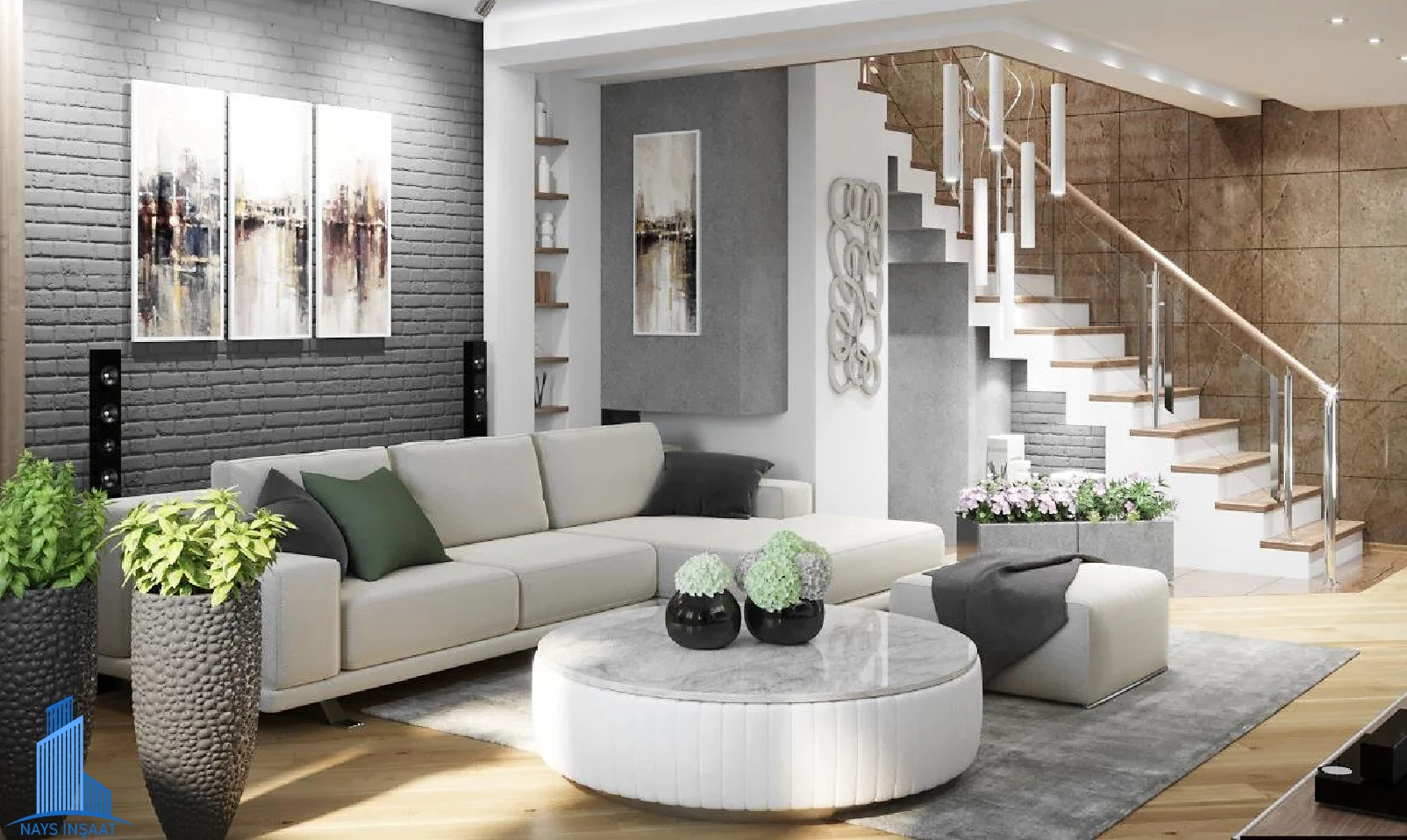 Loft üslubunun daha yumşaq, ev şəraitinə uyğunlaşdırılmış versiyası. Kərpic və beton elementləri yumşaq tekstillərlə balanslaşdırır.